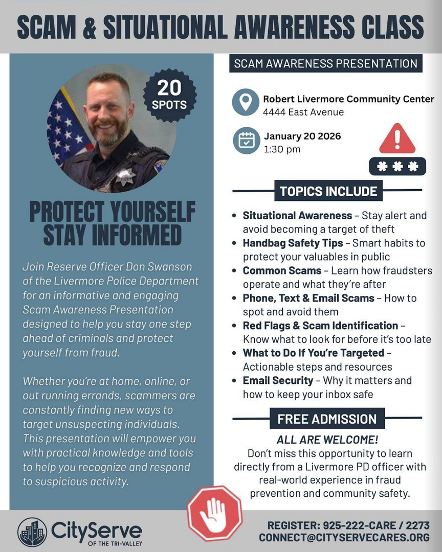 Join reserve officer Don Swanson of the Livermore Police Department for an informative and engaging Scam Awareness presentation designed to help you stay one step ahead of criminals and protect yourself from fraud. This presentation will empower you with practical knowledge and tools to help you recognize and respond to suspicious activity.