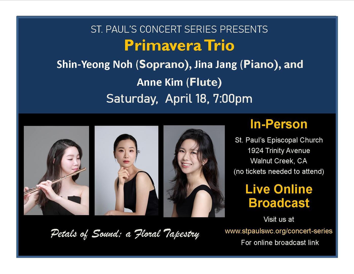 St. Paul's Concert Series is delighted to present Primavera Trio, featuring Soprano Shin-Yeong Noh, Pianist Jina Jang, and Flutist Anne Kim, in a spectacular performance on Saturday, April 18 at 7pm. Each of these accomplished performers are award winners of national and international competitions and have performed in prestigious concert halls all around the world. We are honored to host them here in Walnut Creek, as they debut their ensemble program, "Spring Serenade: Flowers, Love, and Romance."