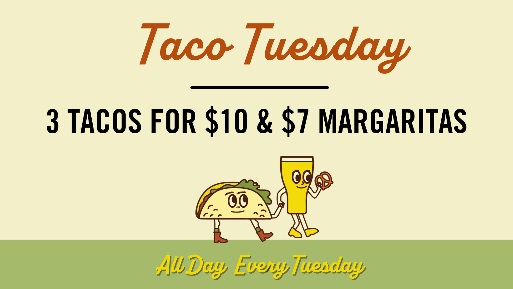 It’s Taco Tuesday! Join us every Tuesday for a delicious deal you can’t miss! Savor our mouthwatering tacos and refreshing margaritas: