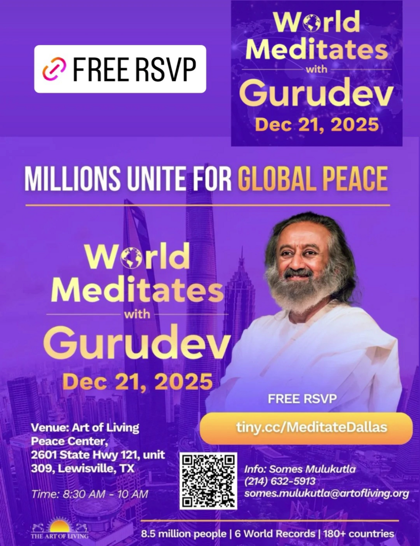 Join the Lewisville community for a free, peaceful gathering in honor of World Meditation Day, officially recognized by the United Nations. Connect with neighbors and participate in a global meditation livestreamed from New York City with spiritual leader and humanitarian Gurudev Sri Sri Ravi Shankar. Last year’s event set a Guinness World Record for the most-viewed guided meditation livestream.