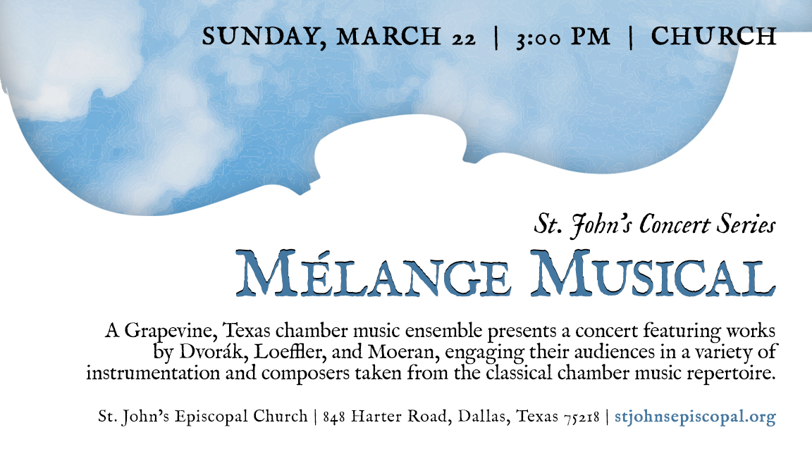 Concerts at St. John’s presents Mélange Musical, a Grapevine, Texas, based chamber music ensemble, presents a chamber music concert with works by Dvorak, Loeffler, and Moeran, with engaging commentary allowing the listener a glimpse into the world of the music. Featuring Susanna Hilliard, oboe; Chuong Vu, violin; Iris Messinger, viola; John Landefeld, cello; and Michael Schneider, piano. This concert is free and and reception follows.