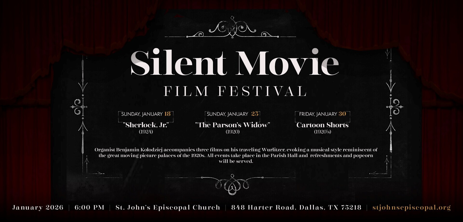 Concerts at St. John’s presents a screening of the 1920 Scandinavian silent movie, The Parson’s Widow, accompanied by organist Benjamin Kolodziej, on Sunday, 25 January, at 6pm. Directed by the acclaimed Danish director Carl Dreyer, this drama follows the travails of a young minister sent to a small, Norwegian village. This event takes place in the parish hall, and refreshments will be served. The presence of some scary scenes suggests parental guidance for small children.