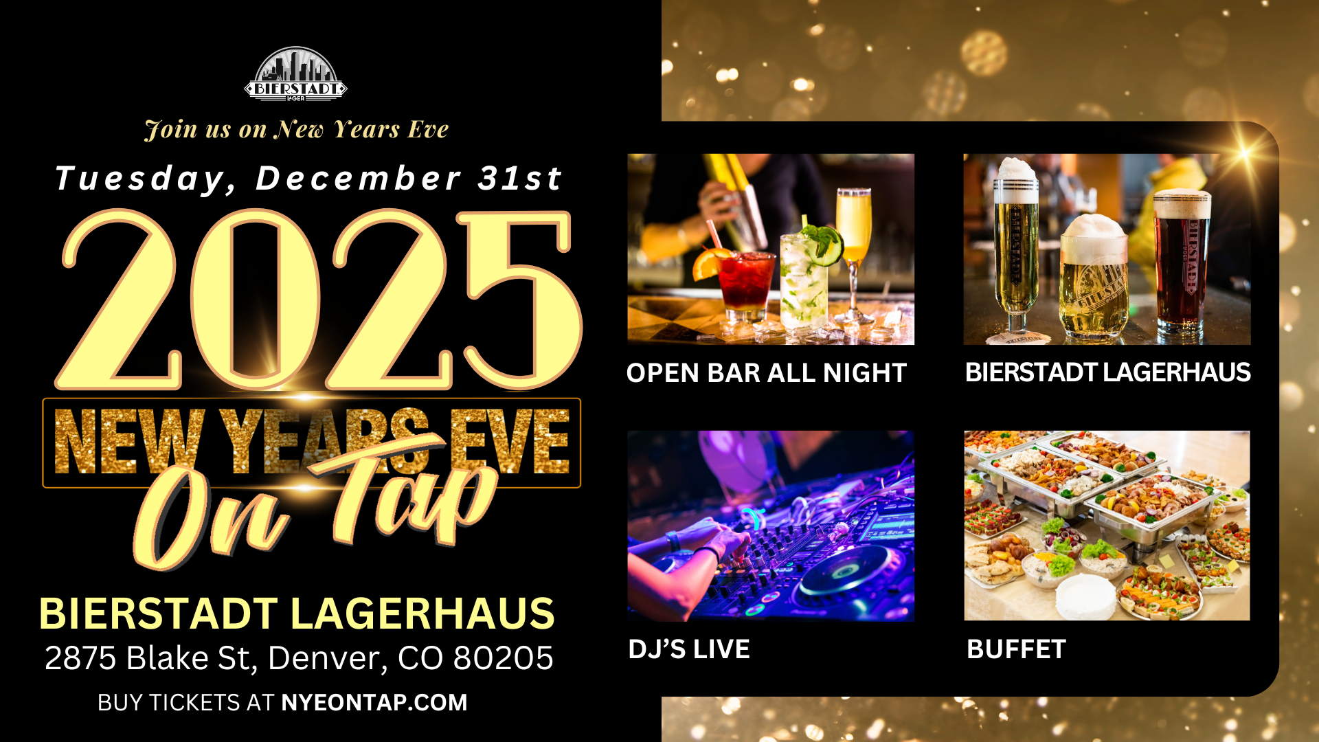 Forget the stuffy hotel ballrooms and the chaotic LoDo dive bars. This year, upgrade your night. We are taking over the massive Bierstadt Lagerhaus for a high-energy celebration that feels less like a "function" and more like the house party of the century—but with way better drinks.