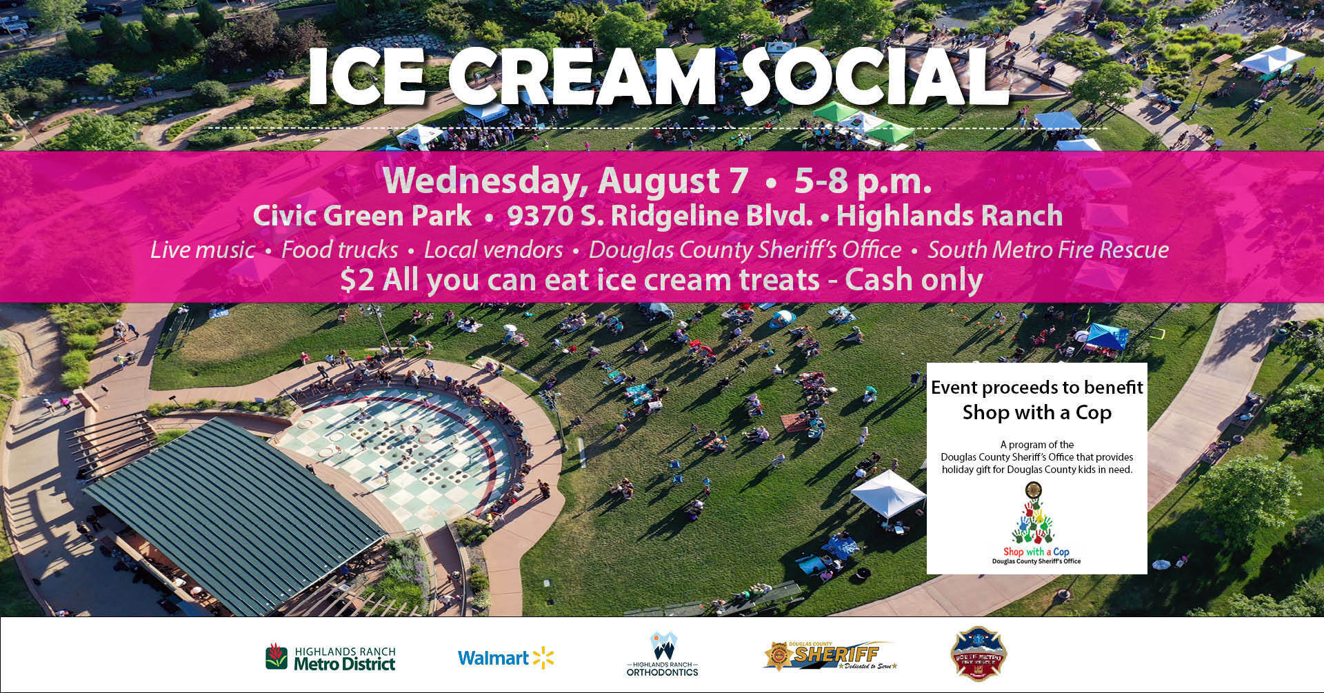 Enjoy all-you-can-eat ice cream treats for $2 and support a good cause at the Ice Cream Social. This annual summer event from the Highlands Ranch Metro District includes a concert by the Highlands Ranch Concert Band, police and fire vehicle demos, food trucks, local vendors and ice cream treats and snow cones donated by Walmart and Highlands Ranch Orthodontics. Proceeds will benefit Shop with a Cop, a program of the Douglas County Sheriff's Office that provides holiday gifts for kids in need.