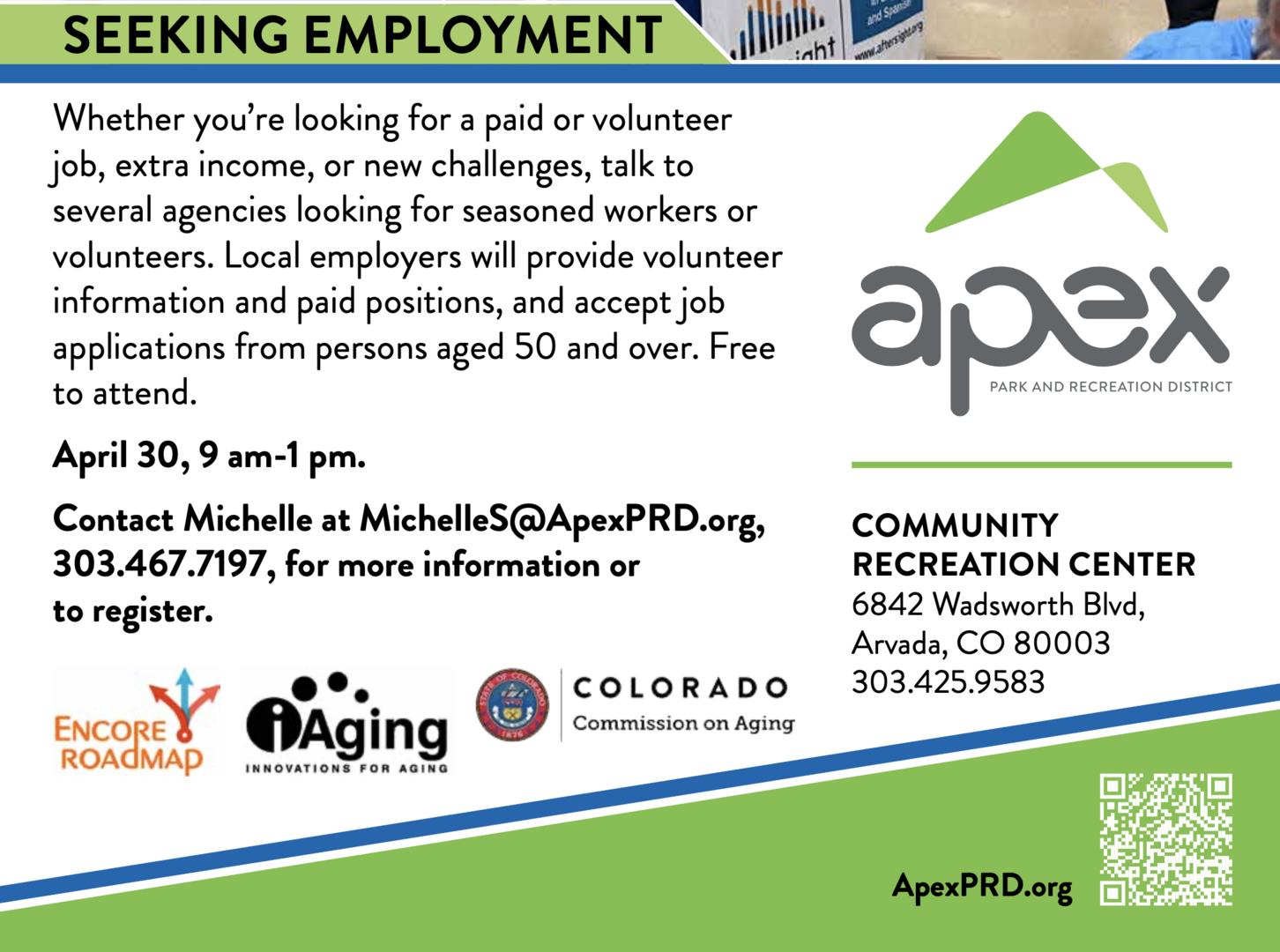 Partners for the Job Fair and Education Sessions include Apex Community Recreation Center, iAging, Colorado Commission on Aging, and Encore Roadmap.