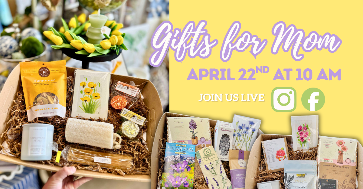 Join us Wednesday, April 22nd at 10 AM for a fun, feel-good Gifts for Mom LIVE event! We’ll be showing off our favorite finds from our Centennial shop, sharing behind-the-scenes picks, and giving you a peek at our Mother’s Day gift boxes (yes—they ship nationwide!)