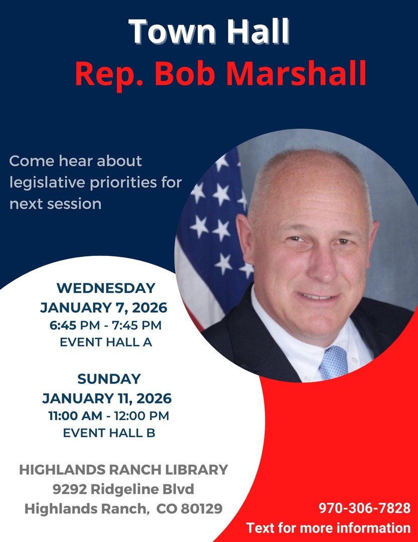 HomeEventsHD43 Townhall - Rep. Bob Marshall HD43 Townhall - Rep. Bob Marshall Wednesday, January 07, 2026 6:45 PM - 7:45 PM 6:45 PM - 7:45 PM See all dates and Times Douglas County Libraries: Highlands Ranch Parking Deals Get a Ride LYFT UBER Add to Calendar 01/07/2026 06:45 PM 01/07/2026 07:45 PM America/Boise HD43 Townhall - Rep. Bob Marshall Legislative session 2026 Priorities Details & Tickets: https://www.upcomingevents.com/denver/events/douglas-county-libraries-highlands-ranch/hd43-townhall-rep-bob-marshall-580567?ref=uceaddevent Douglas County Libraries: Highlands Ranch, 9292 Ridgeline Boulevard, Highlands Ranch, CO, 80129 Set Reminder Legislative session 2026 Priorities