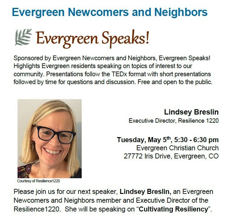 Evergreen Newcomers & Neighbors (ENN) is sponsoring a series that will spotlight Evergreen residents speaking on topics that they are knowledgeable and passionate about. Presentations follow the TEDx format with short presentations followed by questions and discussion. Please join us for our next speaker, Lindsey Breslin, an Evergreen resident and Executive Director of Resilience 1220. She will be speaking on the importance of “Cultivating Resilience”. Free and open to the public.