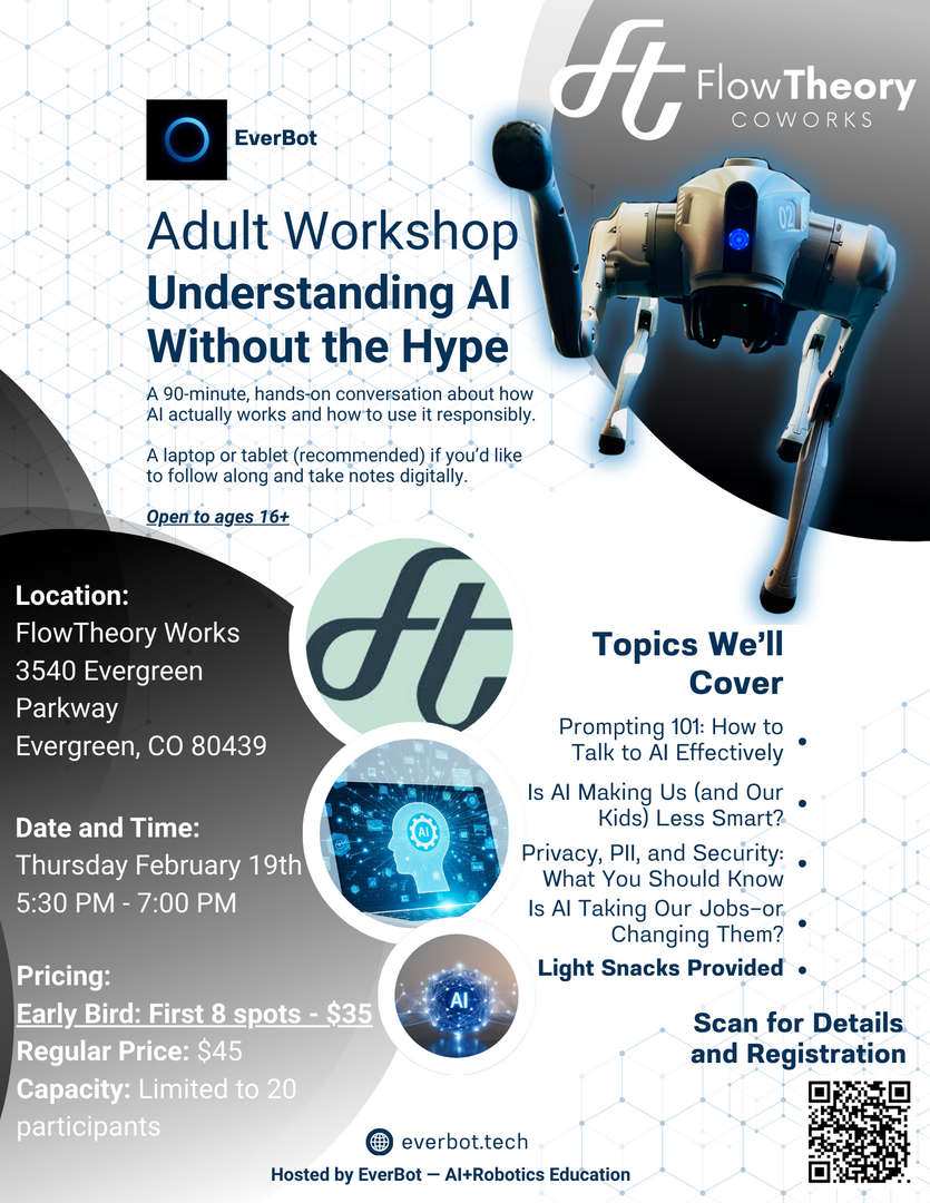 This workshop is hosted by EverBot, a local AI education company based in Evergreen. EverBot provides hands-on AI learning experiences for all ages through after-school programs, community workshops, and educational resources. Learn more at everbot.tech.