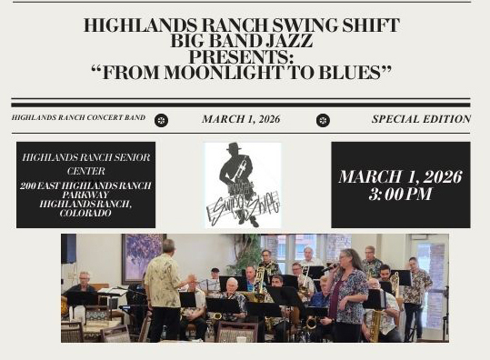 Join us on Sunday, March 1st, at 3:00 PM as the Highlands Ranch Concert Band's 18-piece big band “Swing Shift” brings big band jazz back to the Highlands Ranch Senior Center with an afternoon of jazz, “From Moonlight to Blues. “