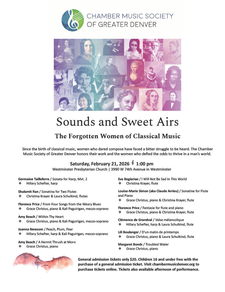Since the birth of classical music, women who dared compose have faced a bitter struggle to be heard. The Chamber Music Society of Greater Denver honors their work and the women who defied the odds to thrive in a man’s world.