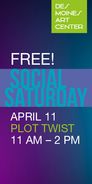 Free! Join the Des Moines Art Center’s April Social Saturday event: Plot Twist! Enjoy book nooks for reading in the galleries, crafts in the Art School studios, a guided tour, a unique performance in Levitt Auditorium, treats in the Art Center Café, and so much more!