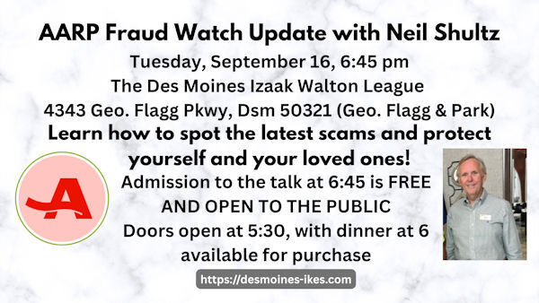 AARP's Neil Shultz will be at The Des Moines Izaak League Tuesday, September 16, 6:45 pm, with an update on the latest scams and how to avoid them! Learn how to protect yourself and your loved ones through the AARP Fraud Watch Network. From gift card scams, to Medicare fraud, to phone scams, fraudsters are very active and deceptive. Your best bet is to stay informed and, in addition to attending Neil's update, AARP's Fraud Watch Network can help you do that along with offering support through their Fraud Helpline at 877-908-3360. The Helpline is free and available to all! Neil Schultz is a retired Division Chief at the Polk County Sheriff's Office, and has been a member of the AARP Iowa Fraud Watch team since it began in 2014. Admission for Neil's talk at is FREE and OPEN to the PUBLIC! Doors open at 5:30 with Dinner at 6 available for purchase.