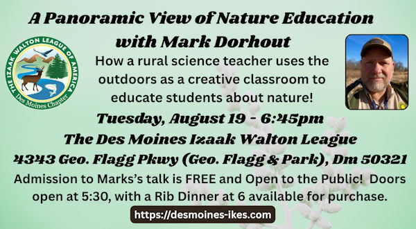 Join Science Educator Mark Dorhout Tuesday August 19 at the Des Moines Izaak Walton League to learn about why and how outdoor education not only is a great way to engage our youth but is also an essential component to benefit our communities long-term! 4343 George Flagg Parkway (intersection of Geo. Flagg & Park), Des Moines 50321. In his 4 years at Panorama, in Panora, IA, he has developed an Outdoor Education program using a focus on Environmental Stewardship. Each student spends approximately 45-50 hours in the field with 60-70 hours of follow up instruction. Areas of focus include prairie reconstruction, outdoor observation skills, a bird unit that includes making and monitoring a bluebird/wren house for two years, remote sensing and outdoor appreciation through art. Water quality is the next phase of incorporation into the curriculum. Mark has spent over 30 years in public education, working both as a teacher (11 years) and a Middle School Principal (21 years). Most of his life has been spent in Iowa, but he has also lived and taught in Wisconsin and South Dakota. Admission to Mark's talk at 6:45 pm is FREE & OPEN TO THE PUBLIC, with doors opening at 5:30 and a rib dinner at 6 available for purchase.