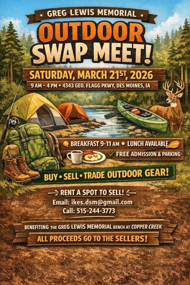 Join us Saturday, March 21st, 2026, for a day of hunting outdoor treasures, great food, and community fun! Whether you're looking to re-home extra gear or find something new and interesting, this is the place to be. You'll find all kinds of outdoor equipment and supplies—perfect for hunters, anglers, campers, and outdoor enthusiasts of all kinds. The Des Moines Izaak Walton League,4343 Geo. Flagg Pkwy (Geo. Flagg & Park), Des Moines, IA 50321. Hours: 9:00 AM – 4:00 PM, Vendor Setup Begins at 7:00 AM. Breakfast served: 9:00 – 11:00 AM, Lunch available during the event. Open to the Public with FREE Admission & Parking. Want to sell? Anyone can rent 1–2 spots to sell their items: Email: [email protected], or Call: 515-244-3773. Rental fees are a donation toward the Greg Lewis Memorial Bench along Copper Creek. ALL PROCEEDS FROM SALES GO DIRECTLY TO THE SELLERS! Come out, support a great cause, and enjoy a day celebrating the outdoors and community. We hope to see you there!