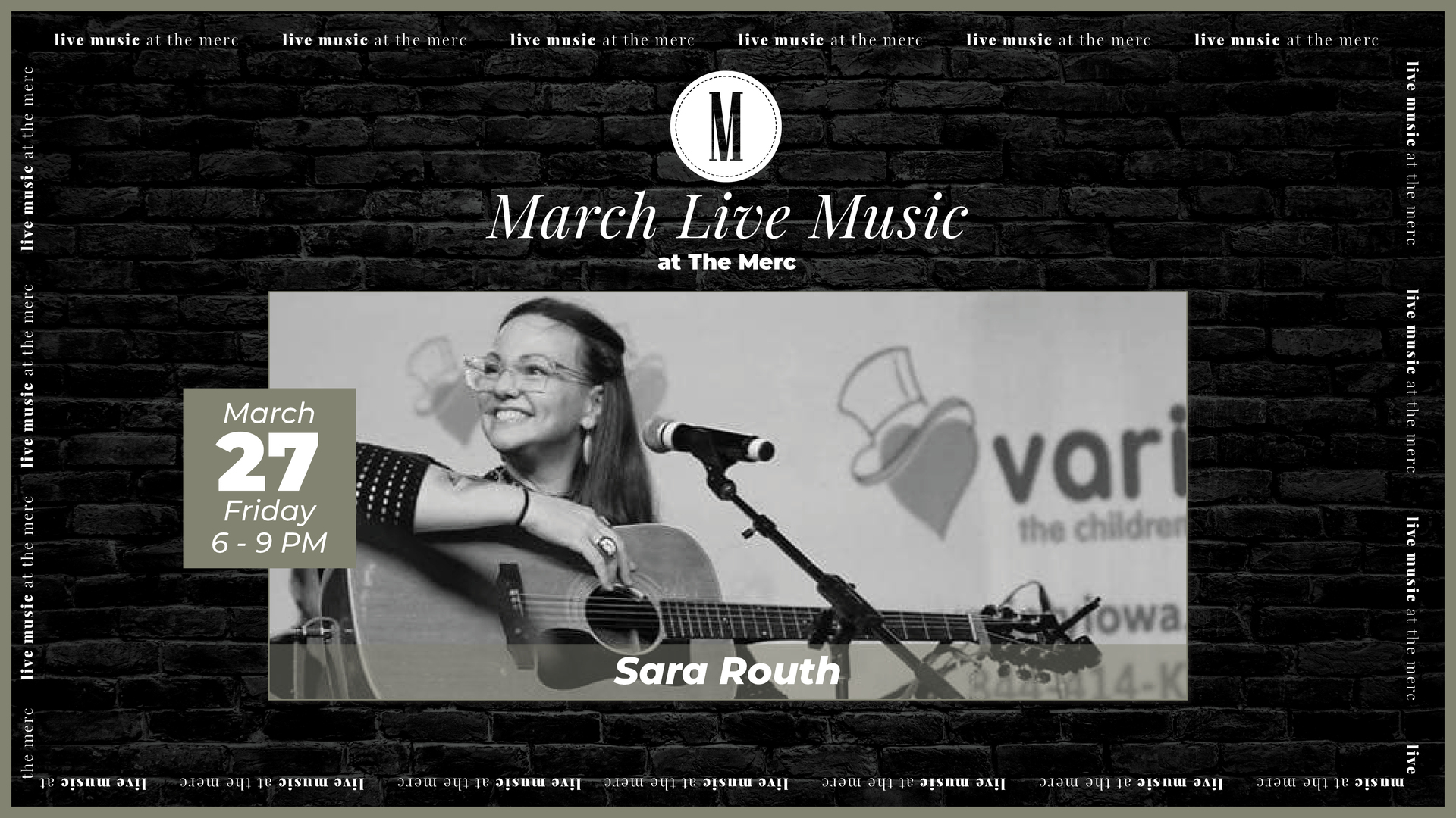 Enjoy wine, snacks, and great company as Sara Routh brings her signature sound to the stage. Come for the music, stay for the atmosphere!