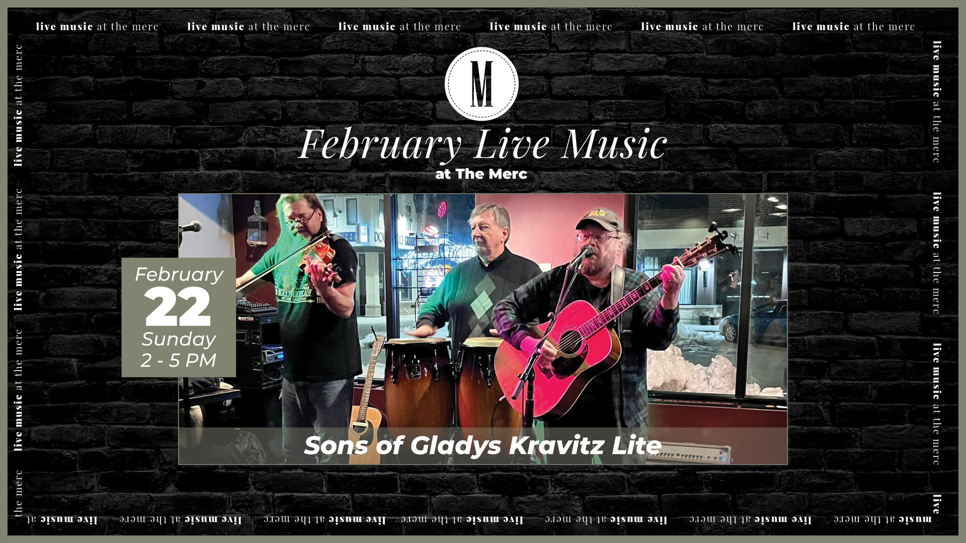 Join us Sunday, February 22 from 2:00 PM – 5:00 PM at Middlebrook Mercantile for an afternoon of live music with Sons of Gladys Kravitz Lite!