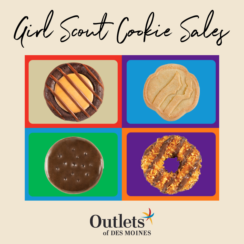 Support the Girl Scouts of Greater Iowa by purchasing delicious Girl Scout Cookies at the Outlets of Des Moines Food Pavilion. Local Girl Scout troops will be on-site from February 13 through March 29, 2026. Enjoy all your favorites including Thin Mints, Caramel deLites, Peanut Butter Patties, Trefoils, Peanut Butter Sandwiches, Adventurefuls, Lemonades – as well as the newest Girl Scout Cookie, Exploremores! featuring Rocky Road ice cream-inspired flavors of chocolate, marshmallow, and toasted almond crème.