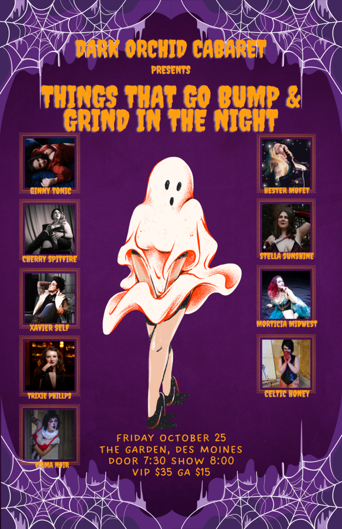 Prepare for a night of spine-tingling allure and seductive thrills at our Halloween-themed burlesque extravaganza, "Things That Go Bump & Grind in the Night"! Join us at The Garden Nightclub for an enchanting evening where the spooky meets the sultry in a celebration of all things eerie and exciting.