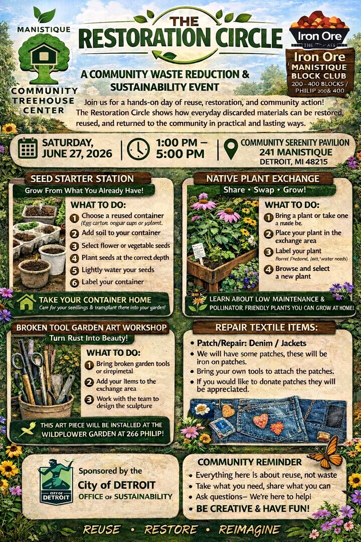 The Restoration Circle is a one-day outdoor waste reduction and sustainability event hosted at the Community Serenity Pavilion in Detroit’s Jefferson Chalmers community. This hands-on event brings residents together to learn practical ways to reuse and repurpose everyday materials. Participants will create seed starters using recycled containers, exchange plants to support biodiversity, and transform broken garden tools into a permanent art installation for the Wildflower Garden at 266 Philip. A textile repair station will offer iron-on patches for denim and jackets, encouraging clothing reuse. The event promotes circular economy practices by reducing landfill waste while strengthening community connection. Attendees will take home planted containers to grow at home, extending the impact beyond the event.