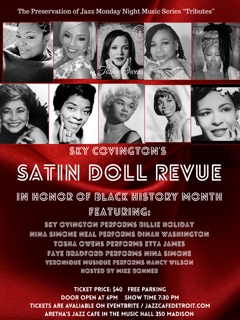 Detroit, MI — The Preservation of Jazz proudly presents the return of one of Detroit’s most celebrated productions: Sky Covington’s Satin Doll Revue — an unforgettable tribute to the iconic women of jazz. Taking place Monday, February 9, 2026, at the legendary Aretha’s Jazz Café (350 Madison, Detroit), this dazzling showcase honors the brilliance, power, and timeless artistry of music’s most beloved female legends.