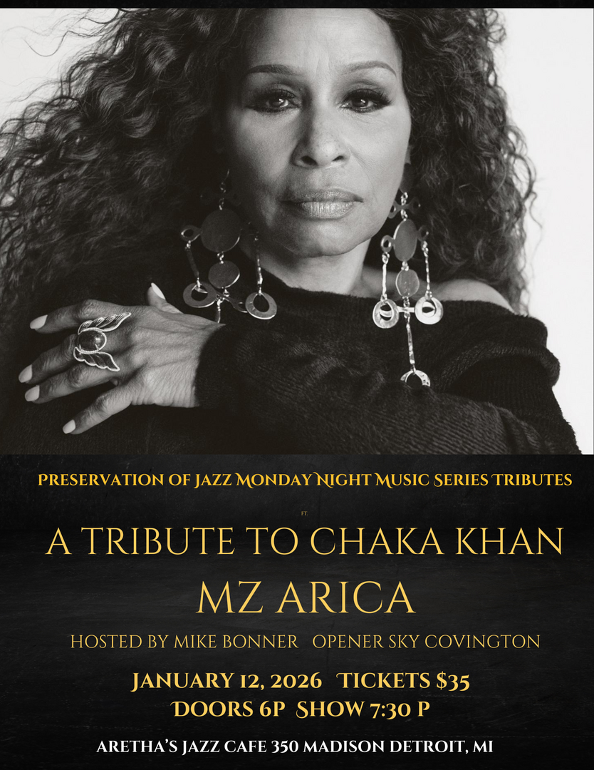 Detroit, MI — Monday, January 12, 2026 — The Preservation of Jazz Monday Night Music Series proudly presents A Tribute to Chaka Khan, an electrifying celebration of the Queen of Funk, Soul, and R&B. This unforgettable evening takes place at Aretha’s Jazz Café, located inside the historic Music Hall Center for the Performing Arts in Detroit.