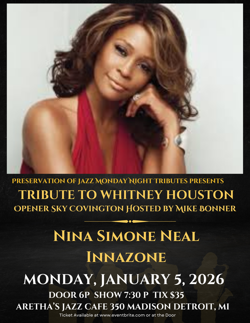 Detroit, MI – After a sold-out success in September, The Preservation of Jazz proudly announces the encore performance of the Whitney Houston Tribute starring the incomparable Nina Simone Neal and her powerhouse band InnaZone, live at Aretha’s Jazz Café on Monday, January 5, 2026, at 7:30 PM.