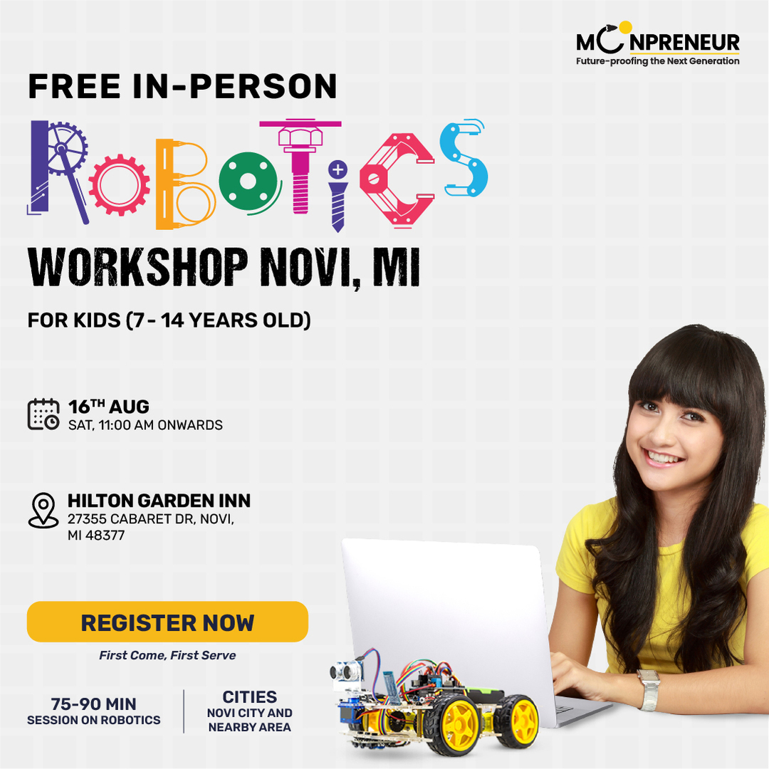Moonpreneur extends a warm invitation to you and your child for our upcoming free in-person robotics workshop at Novi, MI on Saturday, 16th August, 11:00 AM EST.