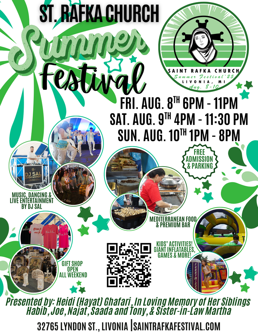 St. Rafka Church Annual Summer Festival Friday, August 8th – Sunday, August 10th on the church property. Our three-day festival features Middle-Eastern food, dancing, premium bar, hookah lounge, raffles, gift shop, giant inflatables, carnival games, henna tattoos and live entertainment by DJ Sal all weekend! Visit saintrafkafestival.com for our full weekend schedule and details. Festival Hours: Fri., Aug. 8th 6:00 PM - 11:00 PM Sat., Aug. 9th 4:00 PM - 11:30 PM Sun., Aug. 10th 1:00 PM - 8:00 PM
