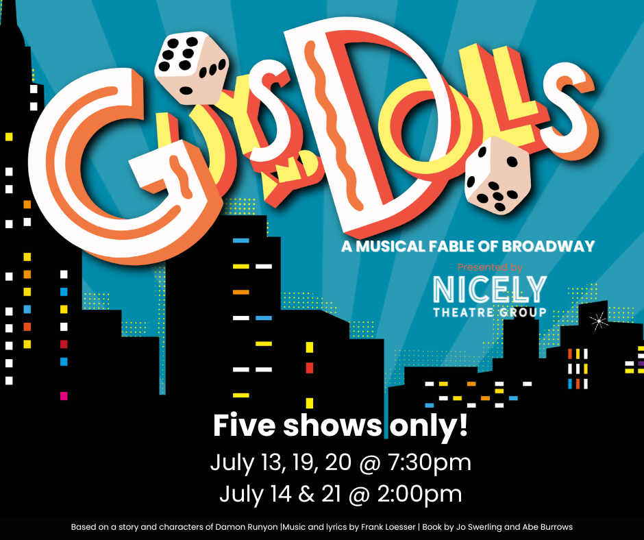Nicely Theatre Group presents the award-winning, beloved classic "Guys and Dolls" at The Berman Center for Performing Arts this July with an all-local, professional cast! If you love musical theatre, you won't want to miss any of the five performances. It's guaranteed you will leave singing "Luck Be a Lady Tonight" and itching for a craps game, a fedora, and a 'guy' or 'doll' on your arm. Each performance is followed by complimentary Nicely extras: a souvenir photo booth, dessert reception, and meet-and-greet with the cast. Cash bar is open prior to show time and at intermission.