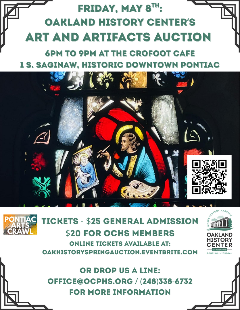 Food, cash bar, music and all the art you could ever hope to bid on! Mix and mingle with us in historic downtown Pontiac. It's a great time and all of the proceeds help support Michigan's oldest historical society (152 years and counting, but folks say we don't look a day over 125)
