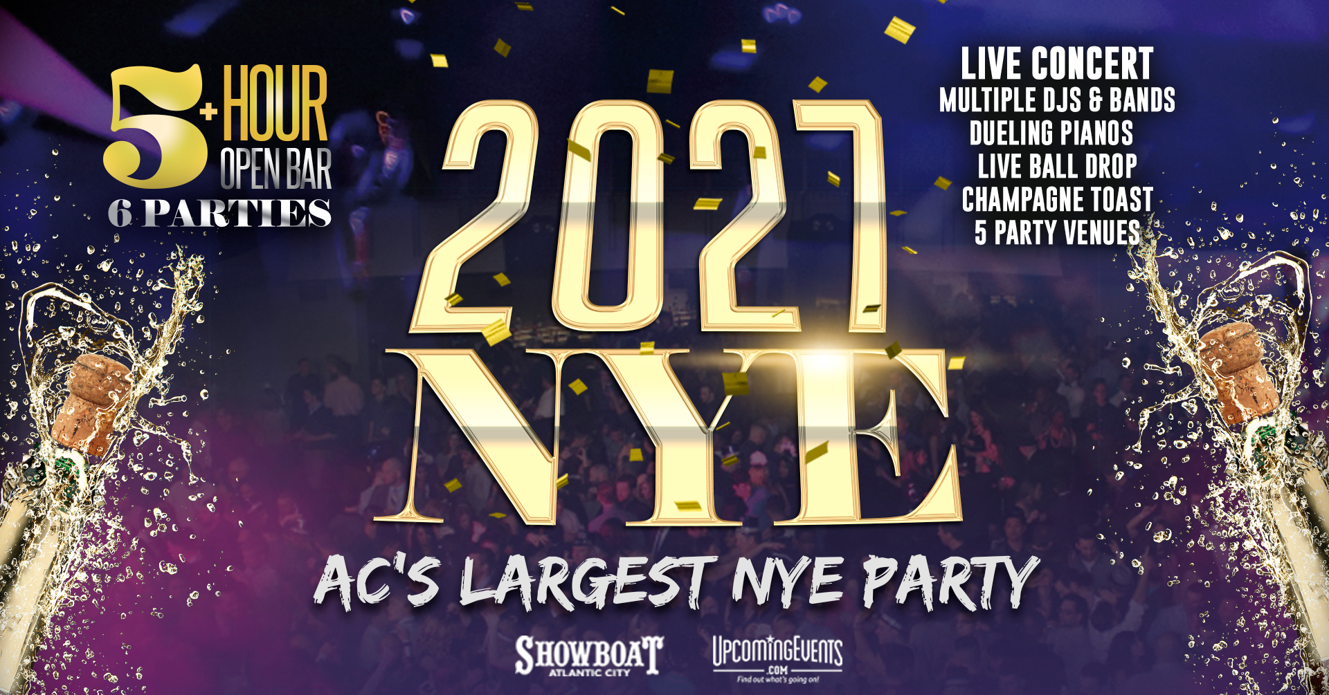 The biggest & most unique NYE event in Atlantic City with 6 Parties under one roof and more space than any other party on the east coast - sold out the past 6 years in a row! Join us at The Showboat in Atlantic City and party from 9:00 PM (8:00 PM for VIP) until 3:00 AM - DJ concert hall party, live bands & light show, massive midnight balloon drop, dueling pianos, karaoke, multiple other DJs, and more! The event sells out every year before New Year's Eve. So, don't wait - buy tickets now. This party will offer something for everyone!