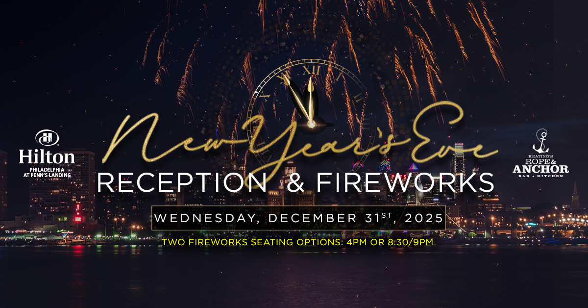Join us on New Year's Eve from 4:00PM - 6:00PM at Keating's Rope & Anchor Bar + Kitchen for a fun family celebration! Bring your kids for various buffet options, delicious desserts, and an incredible fireworks display at 6pm over the Delaware River!