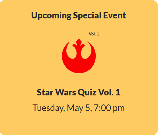 HomeEventsStar Wars Themed Quiz at The Elmont Star Wars Themed Quiz at The Elmont Tuesday, May 05, 2026 7:00 PM - 9:00 PM 7:00 PM - 9:00 PM See all dates and Times The Elmont Event Center Parking Deals Get a Ride LYFT UBER Add to Calendar 05/05/2026 07:00 PM 05/05/2026 09:00 PM America/Bahia_Banderas Star Wars Themed Quiz at The Elmont Bring your team of up to 6 individuals to compete for top prizes. Happy hour specials all night. Event LinksWebsite: https://go.evvnt.com/3567171-0 Details & Tickets: https://www.upcomingevents.com/el-paso/events/the-elmont-event-center/star-wars-themed-quiz-at-the-elmont-632679?ref=uceaddevent The Elmont Event Center, 240 West Castellano Drive, El Paso, TX, 79912 Set Reminder View Event Website » Bring your team of up to 6 individuals to compete for top prizes. Happy hour specials all night. Event LinksWebsite: https://go.evvnt.com/3567171-0 Read More View Less