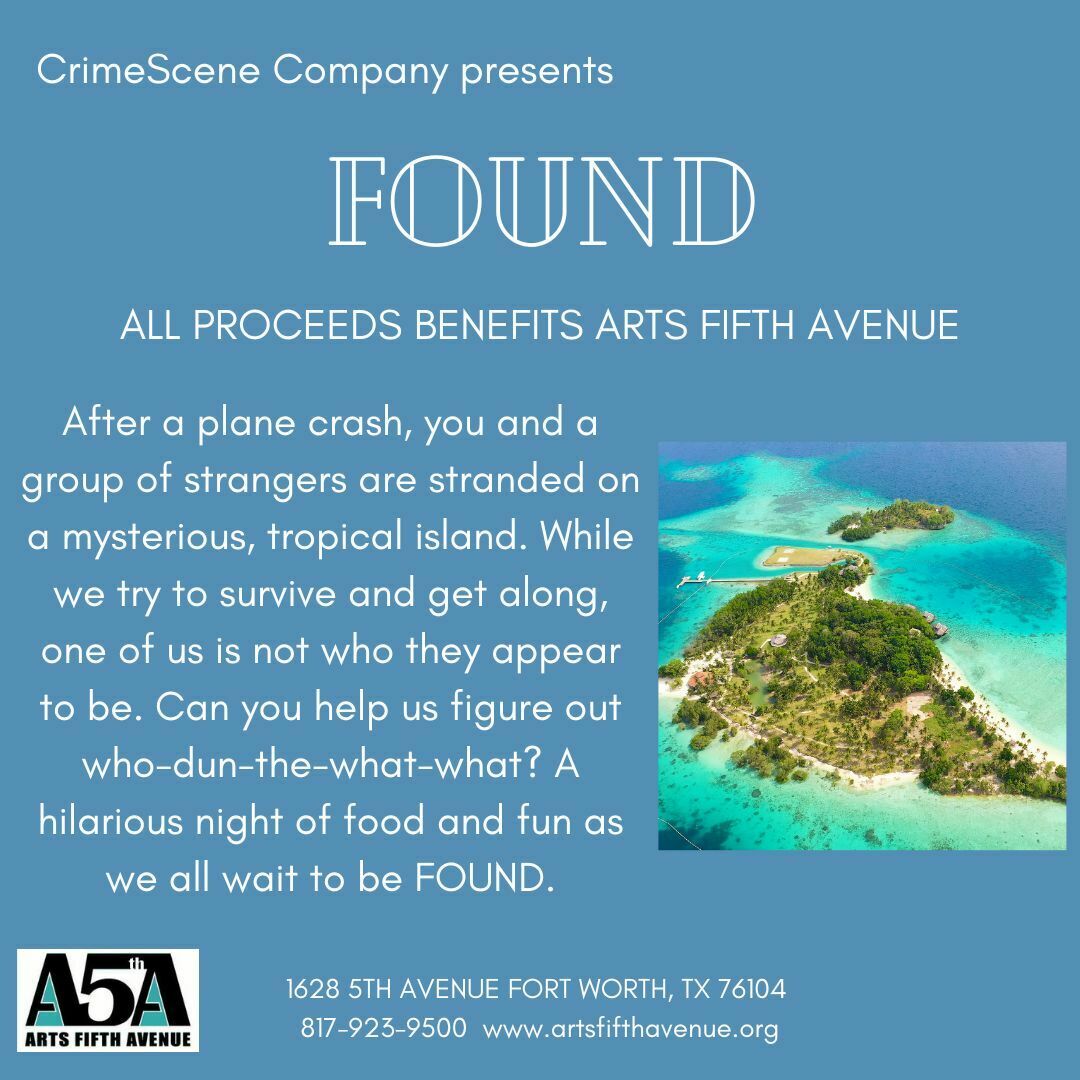 After a plane crash, you and a group of strangers are stranded on a mysterious, tropical island. While we try to survive and get along, one of us is not who they appear to be. Can you help us figure out who-dun-the-what-what? A hilarious night of food and fun as we all wait to be FOUND.