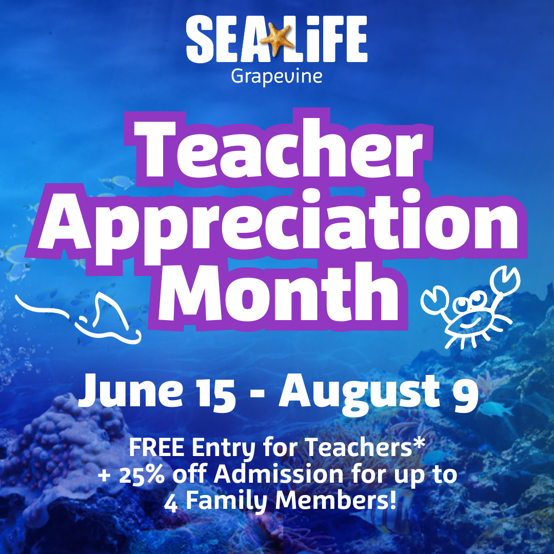 Teacher ID/Badge or pay stub is required at the time of visit. Tickets are limited and must be booked online in advance. Promotion valid only Monday - Friday during event period, 7/15/24-8/9/24.Subject to change at anytime without notice. Final interpretation resides with SEA LIFE Grapevine.
