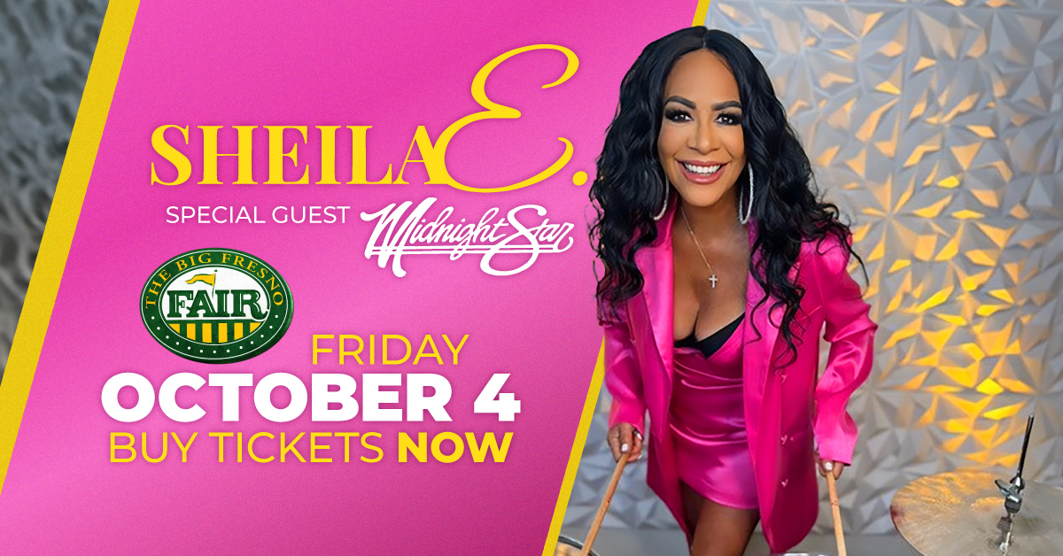 Don’t miss a night of the classics with Sheila E. and special guest star Midnight Star as they take over the Paul Paul Theater Stage on Friday, October 4 as part of the Table Mountain Concert Series presented by Modelo Especial and Toyota during the 2024 Big Fresno Fair! Ticket prices are $33, $22, and $18.