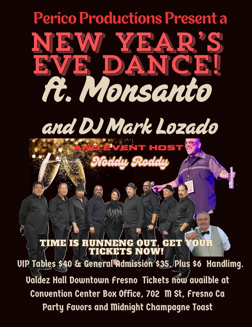 HomeEventsNew Year's Eve Dance Featuring Monsanto and DJ Mark Lozado This Event has Passed New Year's Eve Dance Featuring Monsanto and DJ Mark Lozado Tuesday, December 31, 2024 7:30 PM - 12:00 PM 7:30 PM - 12:00 PM See all dates and Times Valdez Hall Parking Deals Get a Ride LYFT UBER Add to Calendar 12/31/2024 07:30 PM 01/01/2025 12:00 PM America/Dawson New Year's Eve Dance Featuring Monsanto and DJ Mark Lozado -Event LinksFacebook: https://go.evvnt.com/2800697-0 Details & Tickets: https://www.upcomingevents.com/fresno/events/valdez-hall/new-years-eve-dance-featuring-monsanto-and-dj-mark-lozado-359225?ref=uceaddevent Valdez Hall, 702 M Street, Fresno, CA, 93721 Set Reminder Categories Benefits Charity, Fundraising & Charity, Neighborhood, Politics & Activism Neighborhoods Central (Fresno)Edison (Fresno) -Event LinksFacebook: https://go.evvnt.com/2800697-0