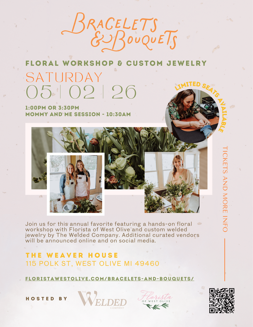 Bracelets and Bouquets is offering three different sessions of floral workshops. Our 10:30 workshop is a Mommy and Mini workshop where you will create a floral arrangement side by side with Florista of West Olive and create matching bracelets with The Welded Company. During our 1:00 and 3:30 session Florista of West Olive will walk you through creating a bowl arrangement using seasonal flower material and create a custom bracelet with The Welded Company. Tickets include coffee and snacks. During the entire event we also have local vendors set up for you to shop before during and after you workshop session. Hope to see you there!