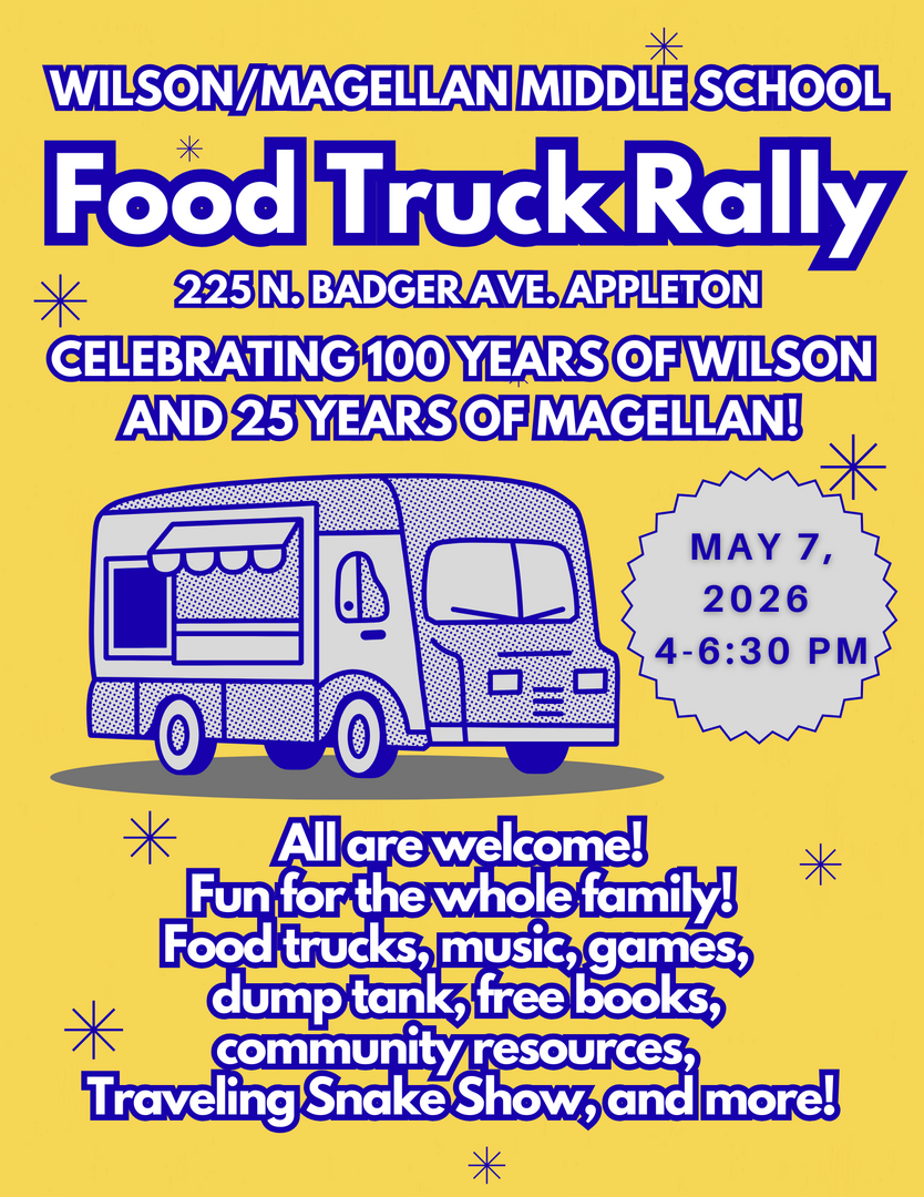 HomeEventsFood Truck Rally at Wilson/Magellan Middle School Food Truck Rally at Wilson/Magellan Middle School Thursday, May 07, 2026 4:00 PM - 6:30 PM 4:00 PM - 6:30 PM See all dates and Times 225 N Badger Ave Parking Deals Get a Ride LYFT UBER Add to Calendar 05/07/2026 04:00 PM 05/07/2026 06:30 PM America/Atikokan Food Truck Rally at Wilson/Magellan Middle School All are welcome! Fun for the whole family! Food trucks, music, games, dump tank, free books, community resources, Traveling Snake Show, and more! Details & Tickets: https://www.upcomingevents.com/green-bay/events/225-n-badger-ave/food-truck-rally-at-wilsonmagellan-middle-school-633719?ref=uceaddevent 225 N Badger Ave, 225 North Badger Avenue, Appleton, WI, 54914 Set Reminder Categories Charities, Craft Beer, Food, Wine, Drink Specials, Good For Families, Kids & Family, Neighborhood All are welcome! Fun for the whole family! Food trucks, music, games, dump tank, free books, community resources, Traveling Snake Show, and more!