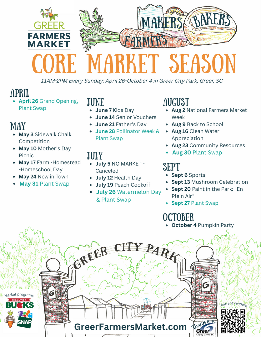 Greer, SC – The Greer Farmers Market is excited to invite the community back to Greer City park in 2026 for their 11th season in Greer. By request, the market is introducing an extended Core Market Season running April 26-October 4, providing three additional market dates in 2026 (total of 30 dates).