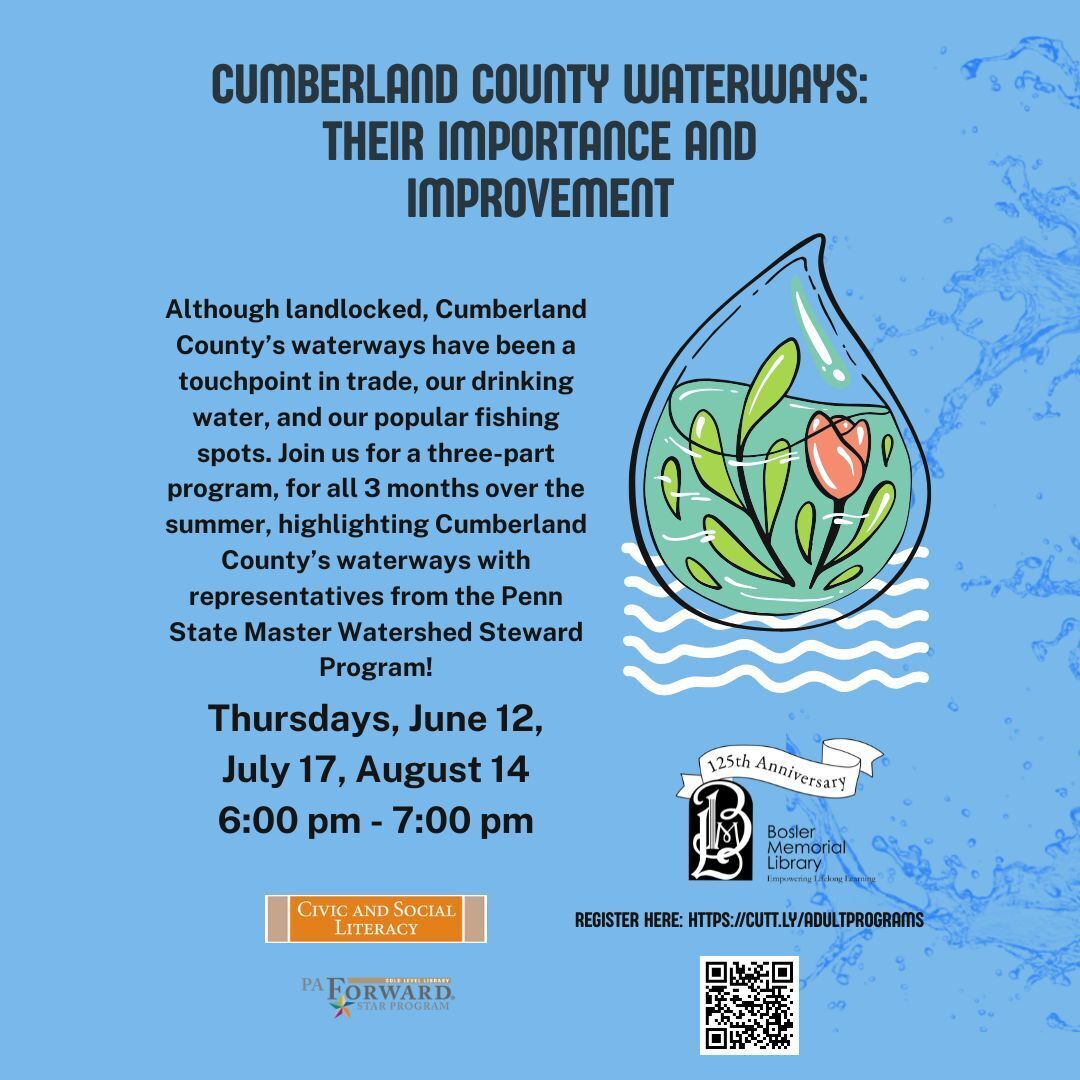 Although landlocked, Cumberland County’s waterways have been a touchpoint in trade, our drinking water, and our popular fishing spots. Join us for a three-part program highlighting Cumberland County’s waterways with representatives from the Penn State Master Watershed Steward Program!