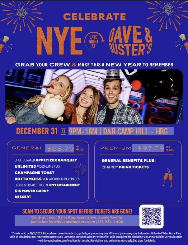 Get your tickets now for New Years Eve at Dave & Buster's in Harrisburg!