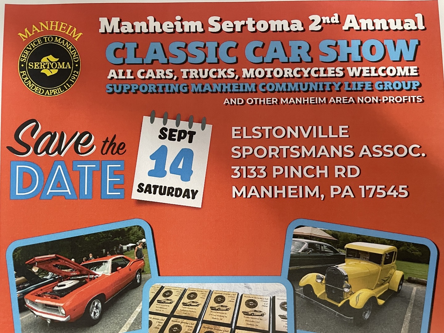 Open to all vehicle years, classic cars, street rods, trucks and motorcycles are welcome to join us for a great day with many car enthusiasts! The first 200 pre-registered car show vehicle entry owners will receive 1 free cheeseburger/1 free french fry and 1 goody bag sponsored by "Crafty Bastards Society". $20 donation to pre-register or register day of show. Registration starts at 8:00am day of show. Car Show starts at 10:00am RAIN or SHINE. Coffee & Donuts avail 8:00am-10:30am. Pre-selling chicken BBQ lunch tickets, order on registration form or by calling 717-824-2658. Kona Ice will be onsite! 20+ awards will be given away by our local sponsors. Including 2 handcrafted awards by Wayne of Shop 51 will be given away and 1 handcrafted award made by Stiegel Glassworks will be given away. Categories include Participants, Peoples and Sertoma Choice Awards. Door Prizes every half hour all day! Raffle items! It will be a great day for all car, truck, motorcycle enthusiasts! We invite you, your family and friends to enjoy the day with us! DJ Services provided by Allison Entertainment. See our MANHEIM SERTOMA CLUB Facebook page for all information, including the car show registration form. We are excited to see you at the car show!