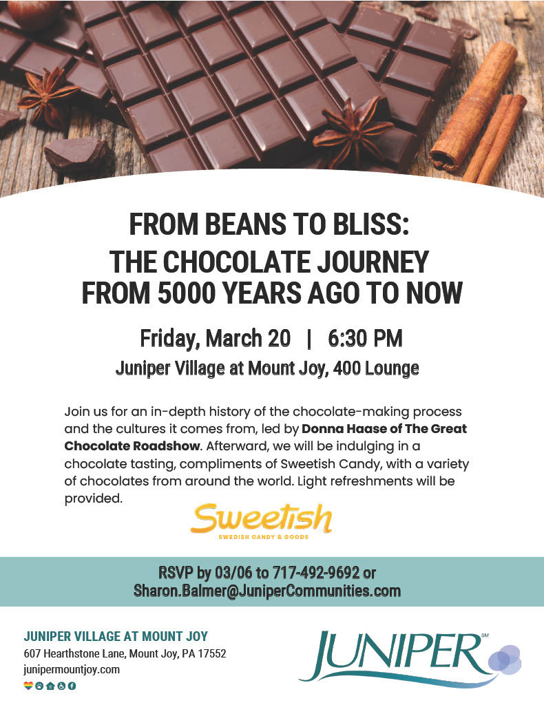 Calling all chocolate lovers! Join us at Juniper Village at Mount Joy on March 20 at 6:30 PM as we welcome Donna Haase of The Great Chocolate Roadshow.