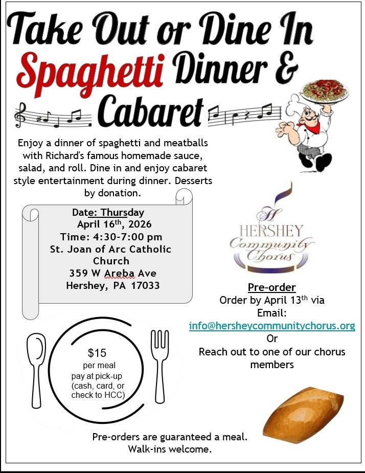 Our members cook and serve a dinner of spaghetti and meatballs, salad, and a dinner roll for take-out or dine-in service. Desserts are available by donation. Tickets for take-out or dine-in service can be purchased in advance or at the door. Pre-orders are guaranteed a meal. Walk-ins are welcome while supplies last. Quarts of sauce are available for purchase – pre-order only.