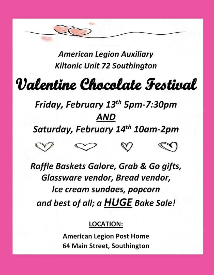 Grab and Go Gifts, Vendors, Raffle Baskets Galore, Ice Cream Sundaes, Popcorn and a huge Bake Sale. Proceeds from this fundraiser will help defray costs for the American Legion Post 72 Auxiliary community events held throughout the year. Come join us and stay for a while and enjoy some chocolate treats or ice cream, buy some raffle tickets and enjoy the company. We hope to see you there.