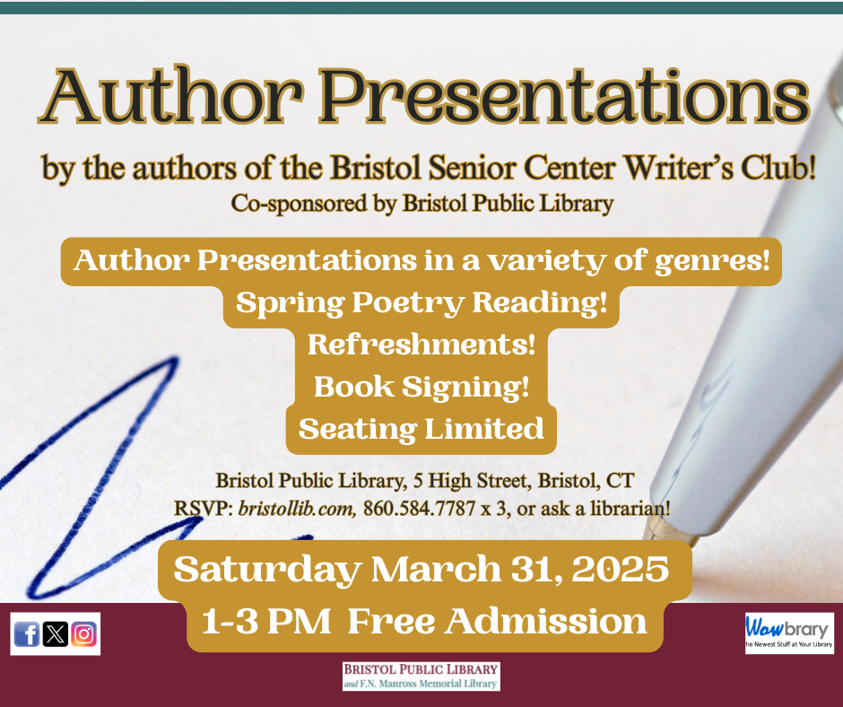 Come join us in person at the library for some awesome Author Presentations from the Bristol Senior Center Writer Club. It’s a great chance to meet local authors, hear their stories, and get inspired by their writing journeys. Whether you’re a budding writer or just love a good story, this event is perfect for you. Don’t miss out on the fun and creativity.