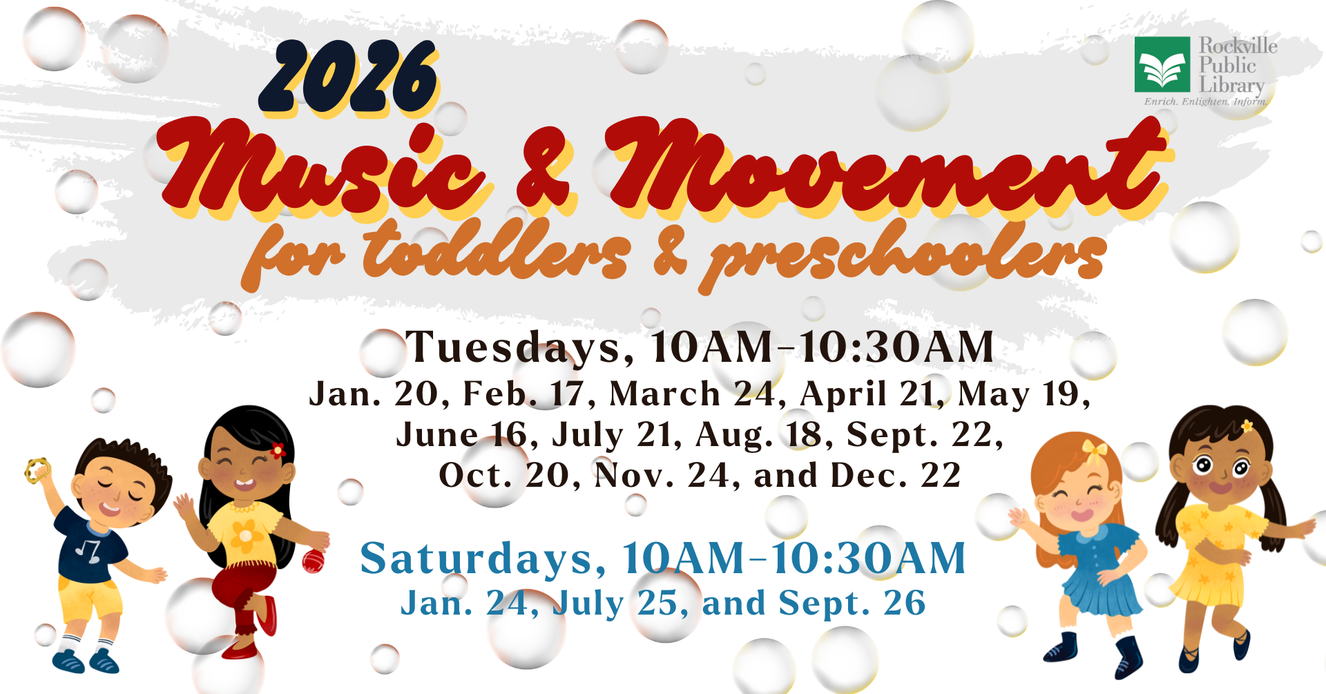 HomeEventsMusic and Movement Music and Movement Saturday, July 25, 2026 10:00 AM - 10:30 AM 10:00 AM - 10:30 AM See all dates and Times Rockville Public Library Parking Deals Get a Ride LYFT UBER Add to Calendar 07/25/2026 10:00 AM 07/25/2026 10:30 AM America/Atikokan Music and Movement Enjoy music, dance, bubbles, various hand held musical instruments, and scarf play. For Toddlers and Preschoolers Details & Tickets: https://www.upcomingevents.com/hartford/events/rockville-public-library/music-and-movement-573518?ref=uceaddevent Rockville Public Library, 52 Union Street, Vernon, CT, 06066 Set Reminder Categories Live Performance, Performing Arts Enjoy music, dance, bubbles, various hand held musical instruments, and scarf play. For Toddlers and Preschoolers
