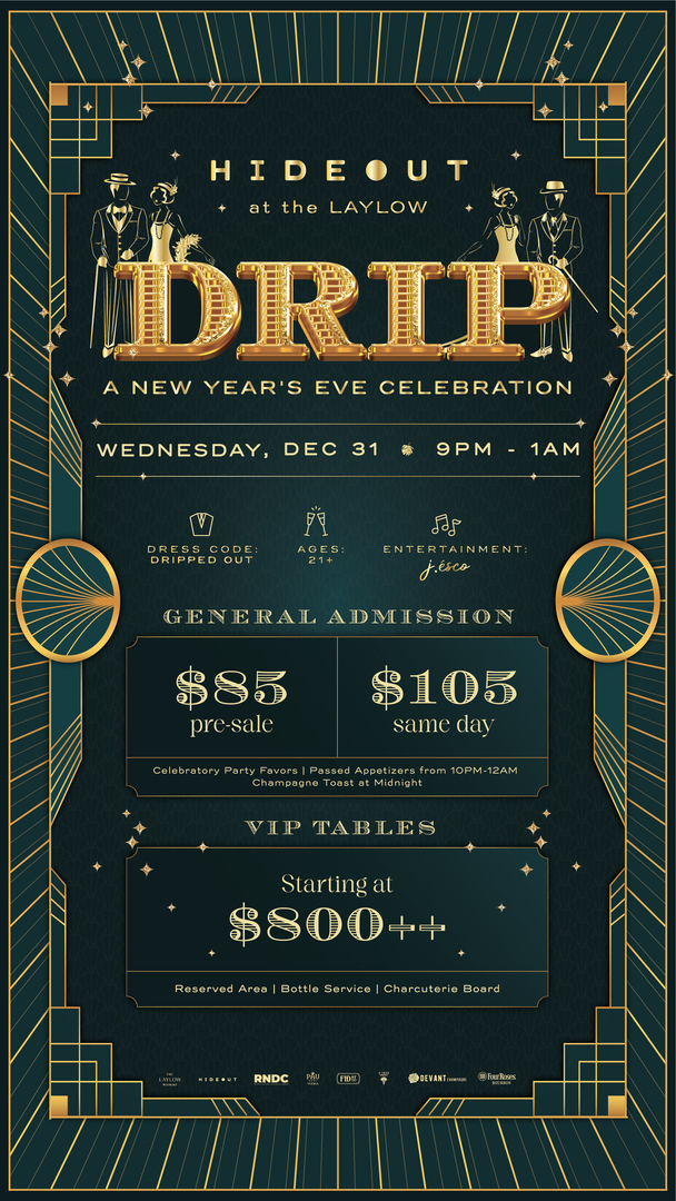 Join us for DRIP: A New Year’s Eve Celebration, where the gold shines, DJ J.Esco brings the heat, and midnight becomes a moment. Come dressed to impress and ring in the new year in style. Level up your night with a VIP Table that includes premium bottle service and a guaranteed reserved section for you and your guests.